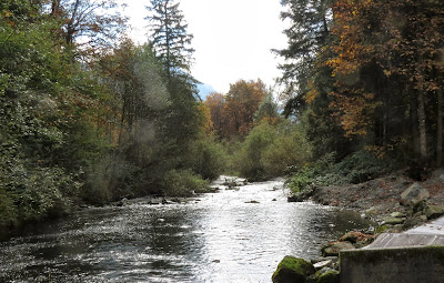 this is Weaver Creek that branches off from the Harrison River and is the 'highway' that the salmon travel up to get to the spawning channels. There was a Great Blue Heron perched down there right in the middle of the creek.
