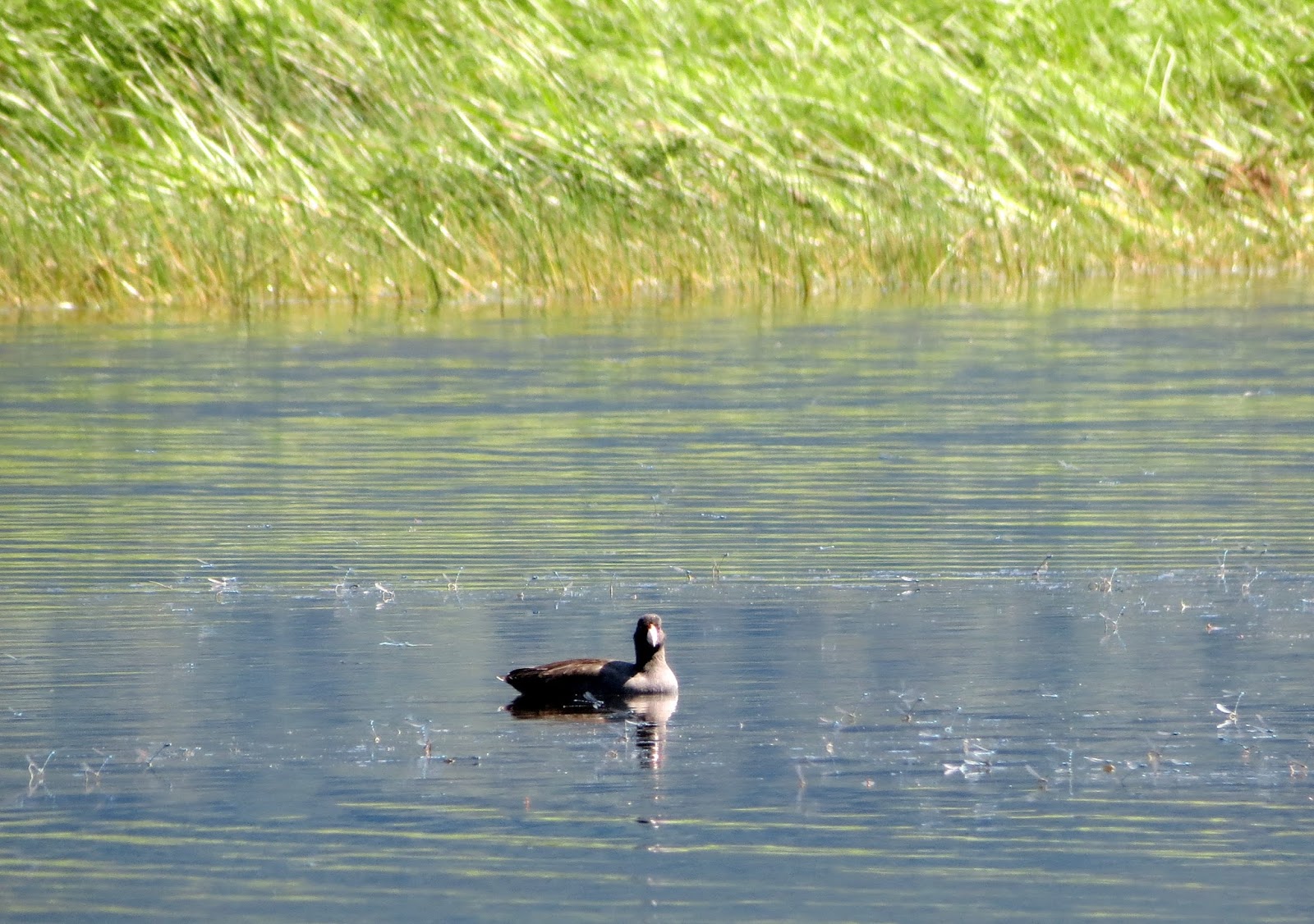 because it was an American Coot! I don't know if I've ever seen a coot right up here in our boat launch area before. I have seen them a couple of times at the log bay and they are sometimes found in fairly large flocks on Harrison Bay. I think this must be an older juvenile.